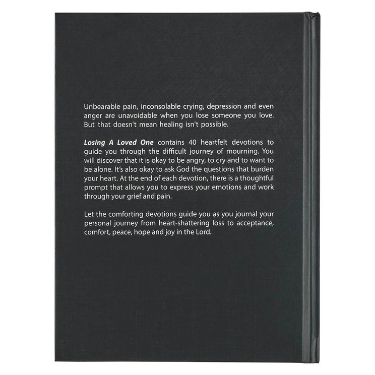 Begin a journey of healing as you meditate on the devotions of the Losing a Loved One Black Hardcover Devotional. This devotional will nurture your soul, and its thoughtful prompts will allow you to express your emotions and work through your grief and pain. Faint black diagonal design, Black cover, Silver-foiled title, Hardcover, 40 devotions, 100 pages, Two-color interior, Presentation page, Size: 7.8” x 5.9” x .6” (198 x 150 x 15mm)
