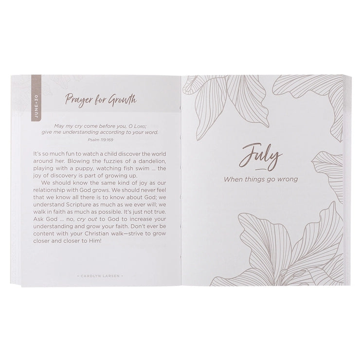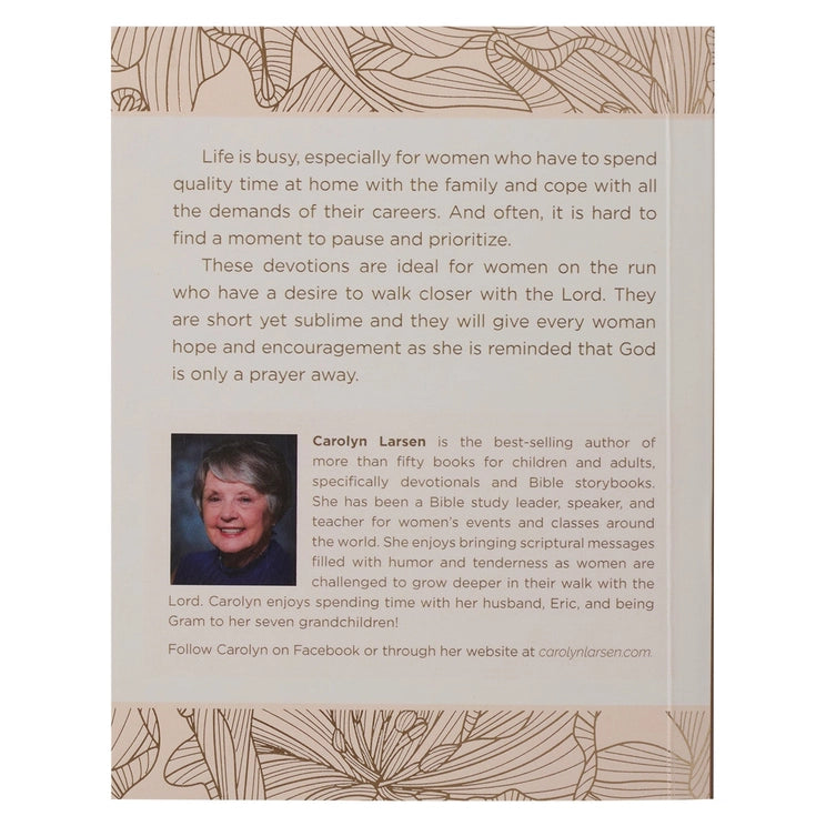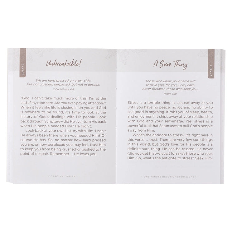 The bite-sized devotional thoughts contained in the Blush Pink Softcover One-Minute Devotions for Women will carry you through days filled with laundry, errands, and carpool schedules. Blush pink background with gold-foiled outlined lilies, Gold-foiled title accents, Softcover, One-color interior, 366 devotions, 400 pages, Size: 5.4" x 4.3" x 0.8" (137 x 109 x 20mm)